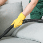 A vacuum cleaner is used to remove dust, hair, and loose dirt from the surface, corners, and under cushions.
